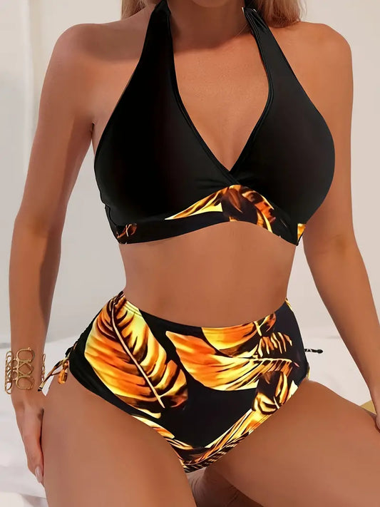 Stylish halter bikini with tropical leaf print