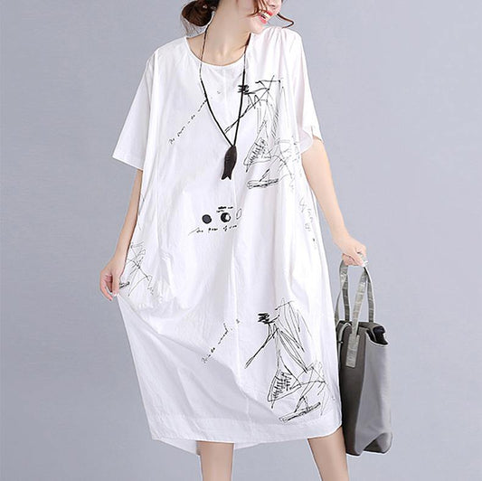 LP | plus size traveling vintage white cotton dress or neck prints natural dress