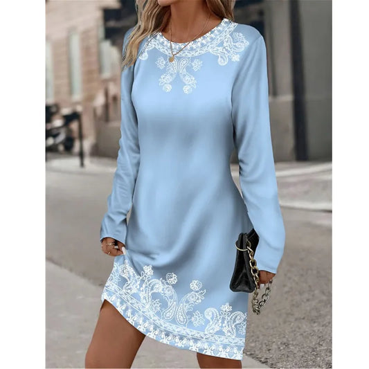 LP | Women Spring Neck Round Sleeve Long Plant Flower Printed Vintage Color Gradient Dress Casual Large Size 3XL Vestidos De Muer