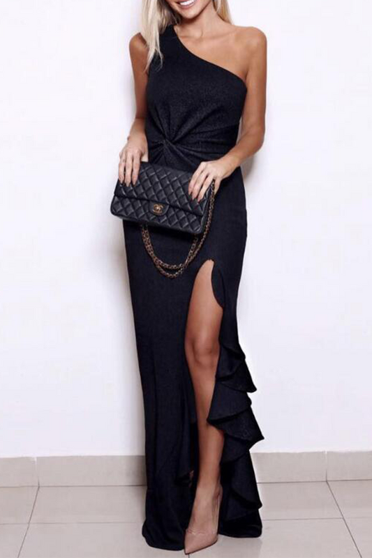 LP | Elegant one-shoulder evening gown with voluminous ruffle opening