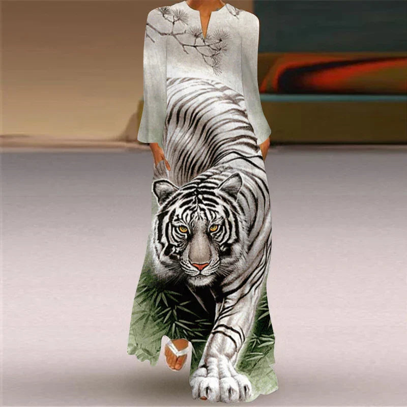 LP | 2024 Women with European and American Cross Borders New V-neck and Long Sleeve Sexy Printed Large Pocket Dress for Foreign Trade