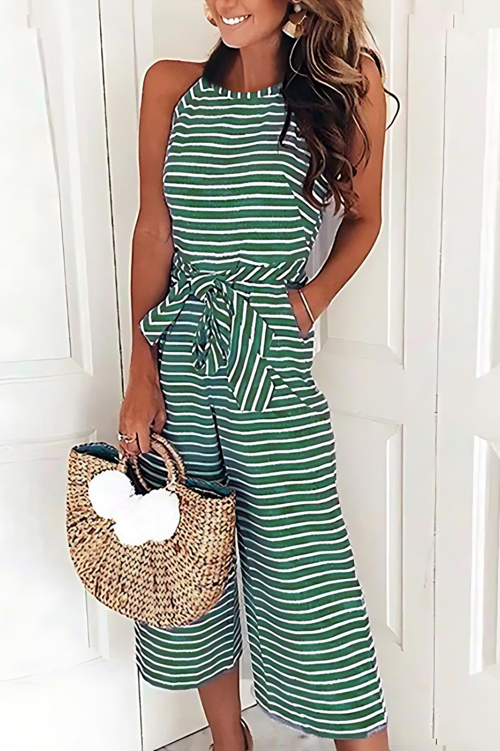 This gestreepte jumpsuit is voorzien van een stoffen riem waarmee je de jumpsuit kunt aantrekken en aanpassen aan je figure, waardoor je een flatterende pasvorm krijgt die perfect bij jou past. De middellange wijde broek zorgt voor luchtigheid en vrijheid, waardoor je je comfortabel en stijlvol kunt voelen tijdens warme zomerdagen. Gemaakt van een geblend katoenen materiaal, biedt deze jumpsuit niet alleen comfort, maar ook duurzaamheid en ademend vermogen.