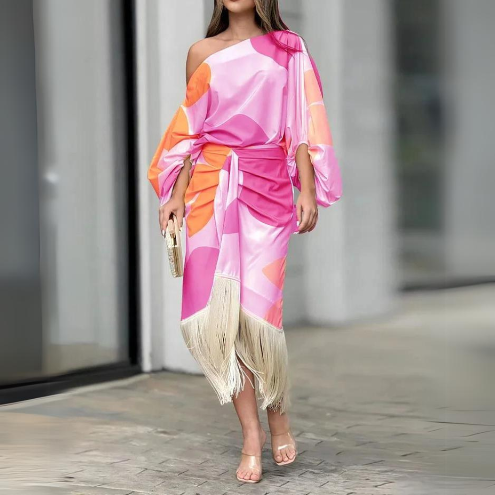 ��Experimenta estilo y elegancia totales con el Conjunto Vesper! Este precioso conjunto, compuesto por una camisa de manga larga y una falda larga con detalles estampados, te da un toque rom��ntico y femenino. Los colores vivos te hacen destacar y reflejan tu personalidad de forma ��nica. La prenda perfecta para brillar con estilo y frescura.